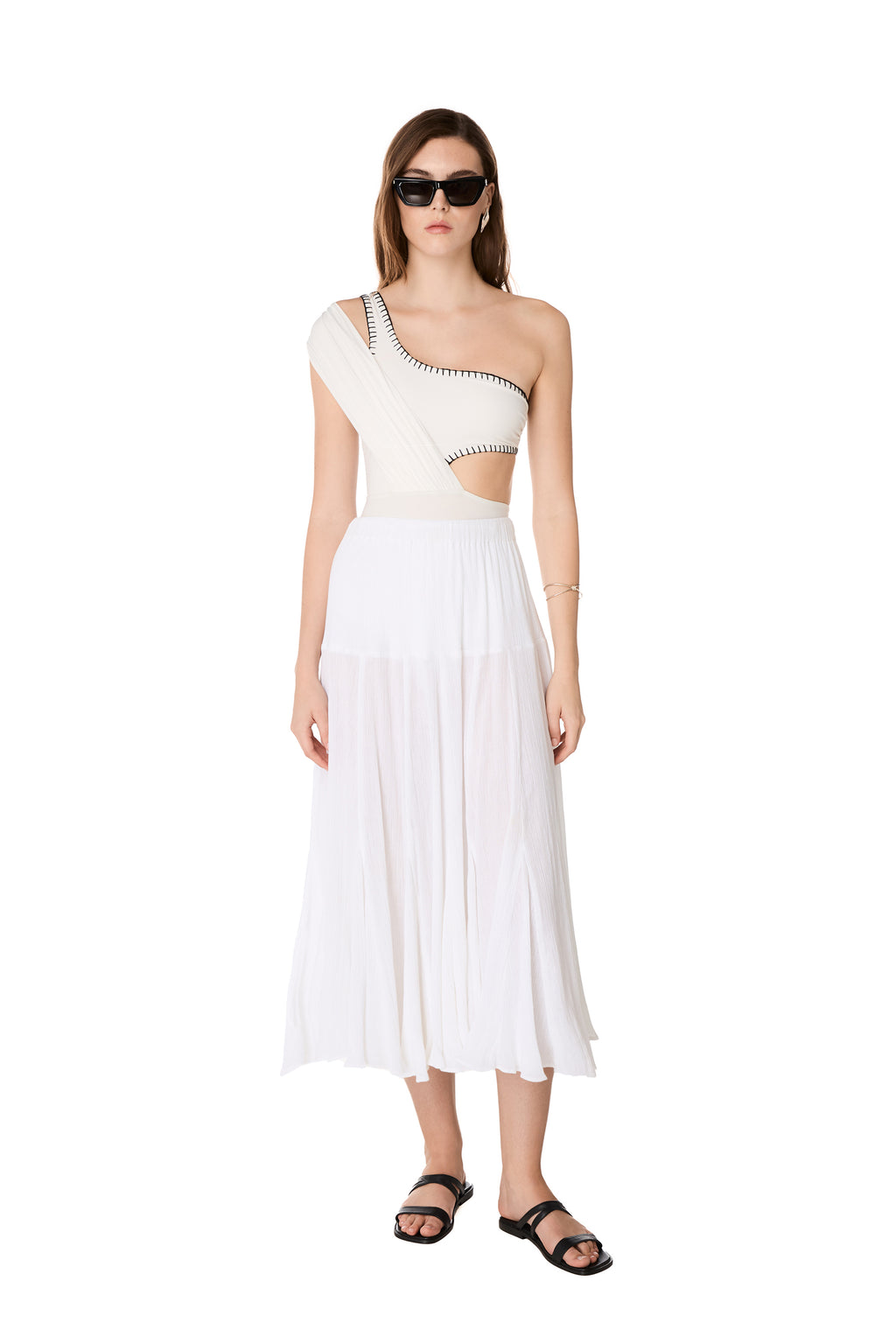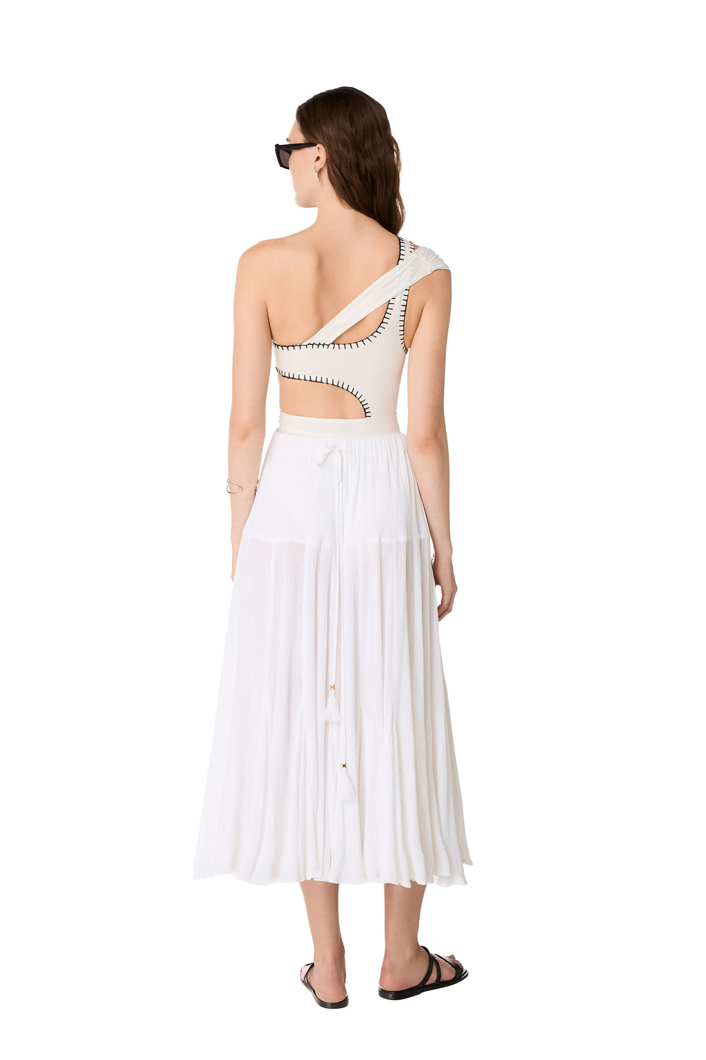 The AETHER midi skirt is made from lightweight crinkled cotton fabric and features an elastic waistband with adjustable waist ties embellished with tassels. The flare of the skirt is composed of multiple triangles.