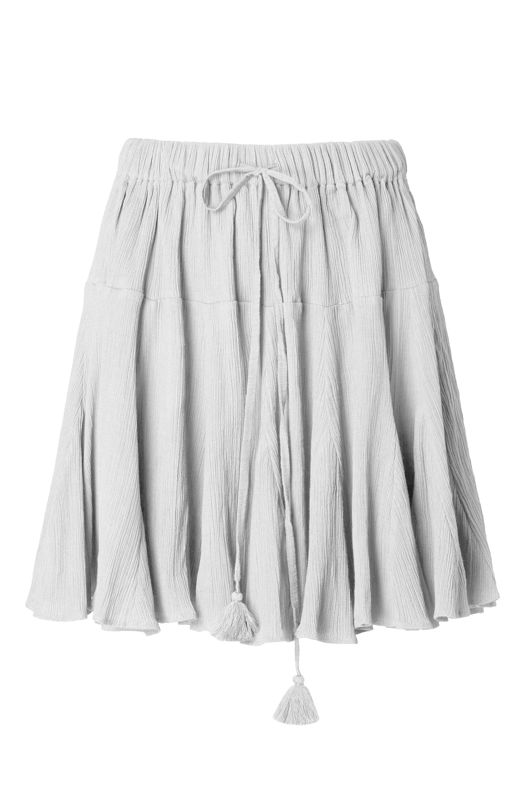 The AETHER mini skirt is made from lightweight crinkled cotton fabric and features an elastic waistband with adjustable waist ties embellished with tassels. The flare of the skirt is composed of multiple triangles.