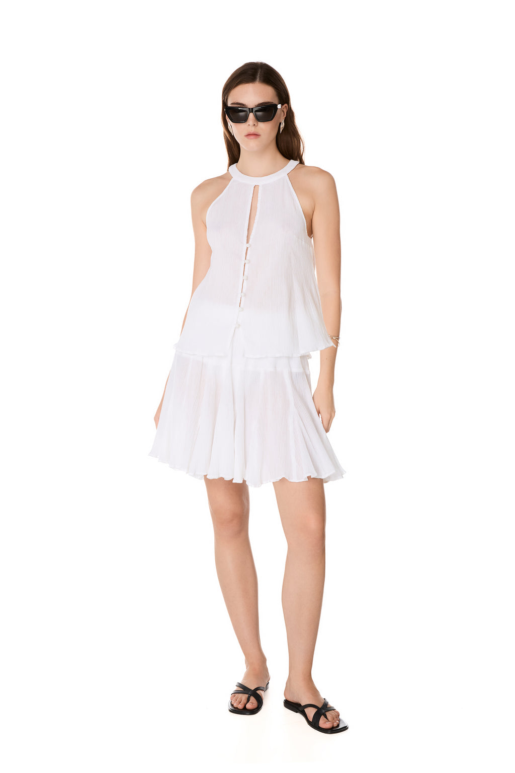 The LETO top features a high-neck halterneck design with back decorative tassels and an open front, closed with knot buttons. It is made of lightweight crinkled cotton fabric.