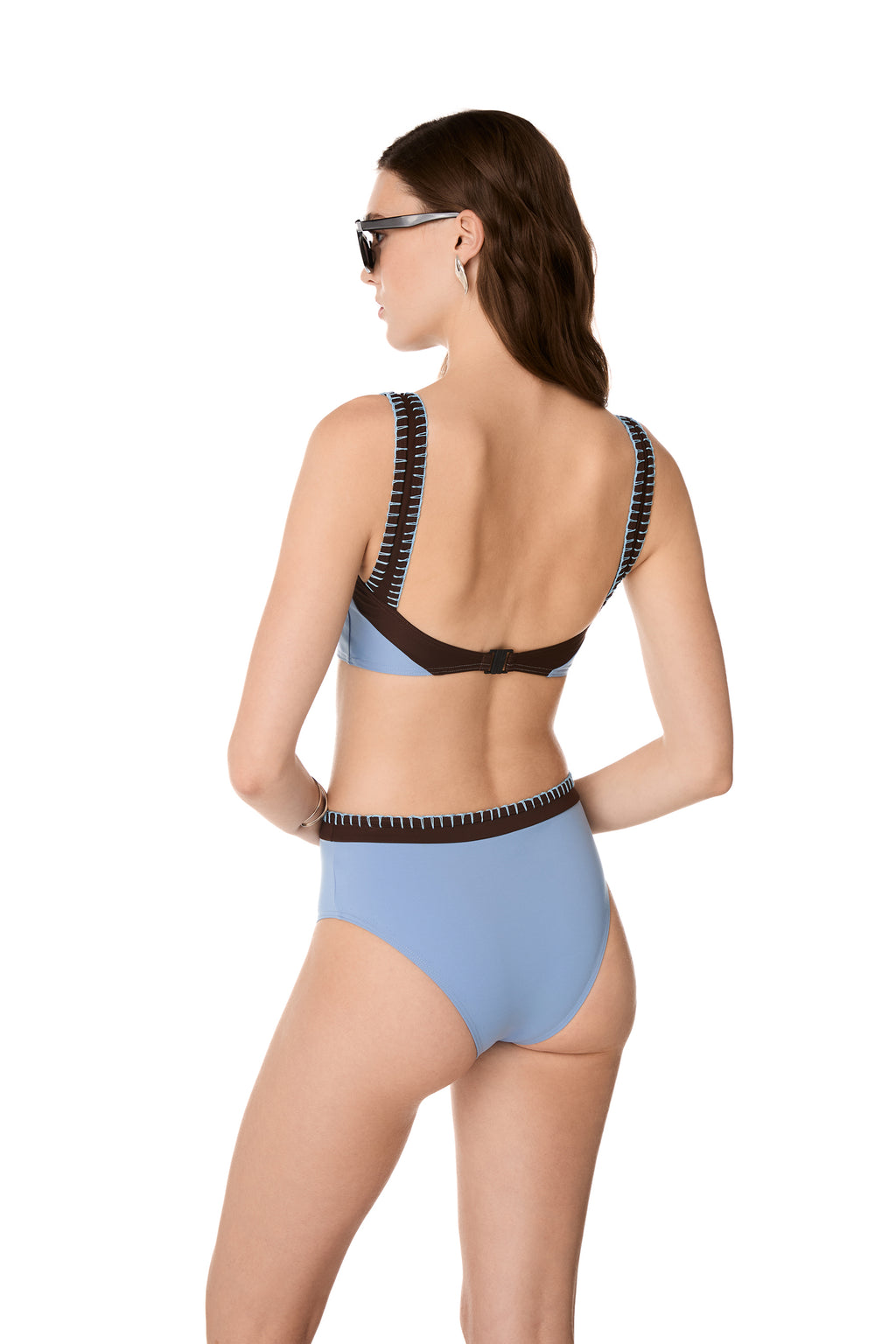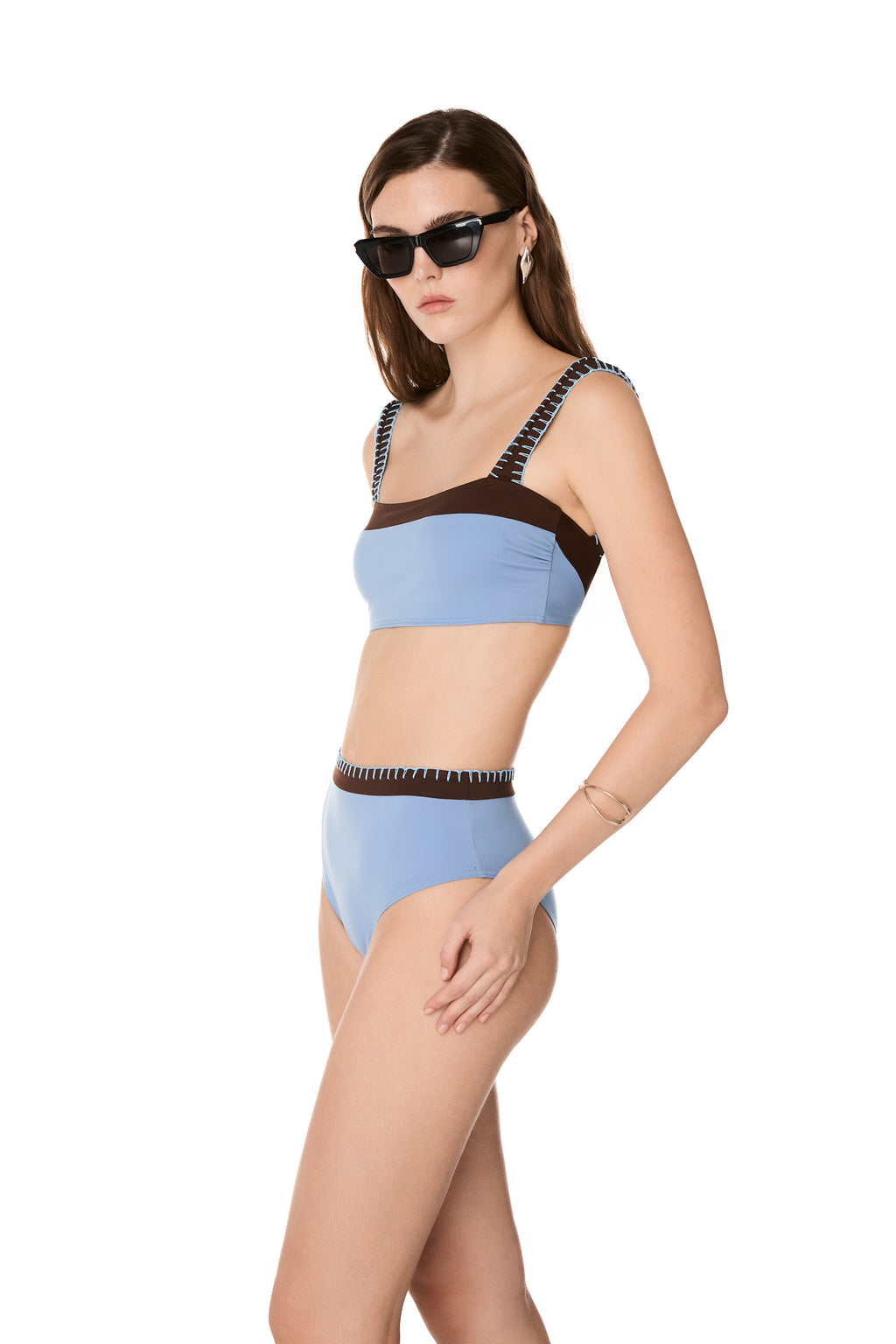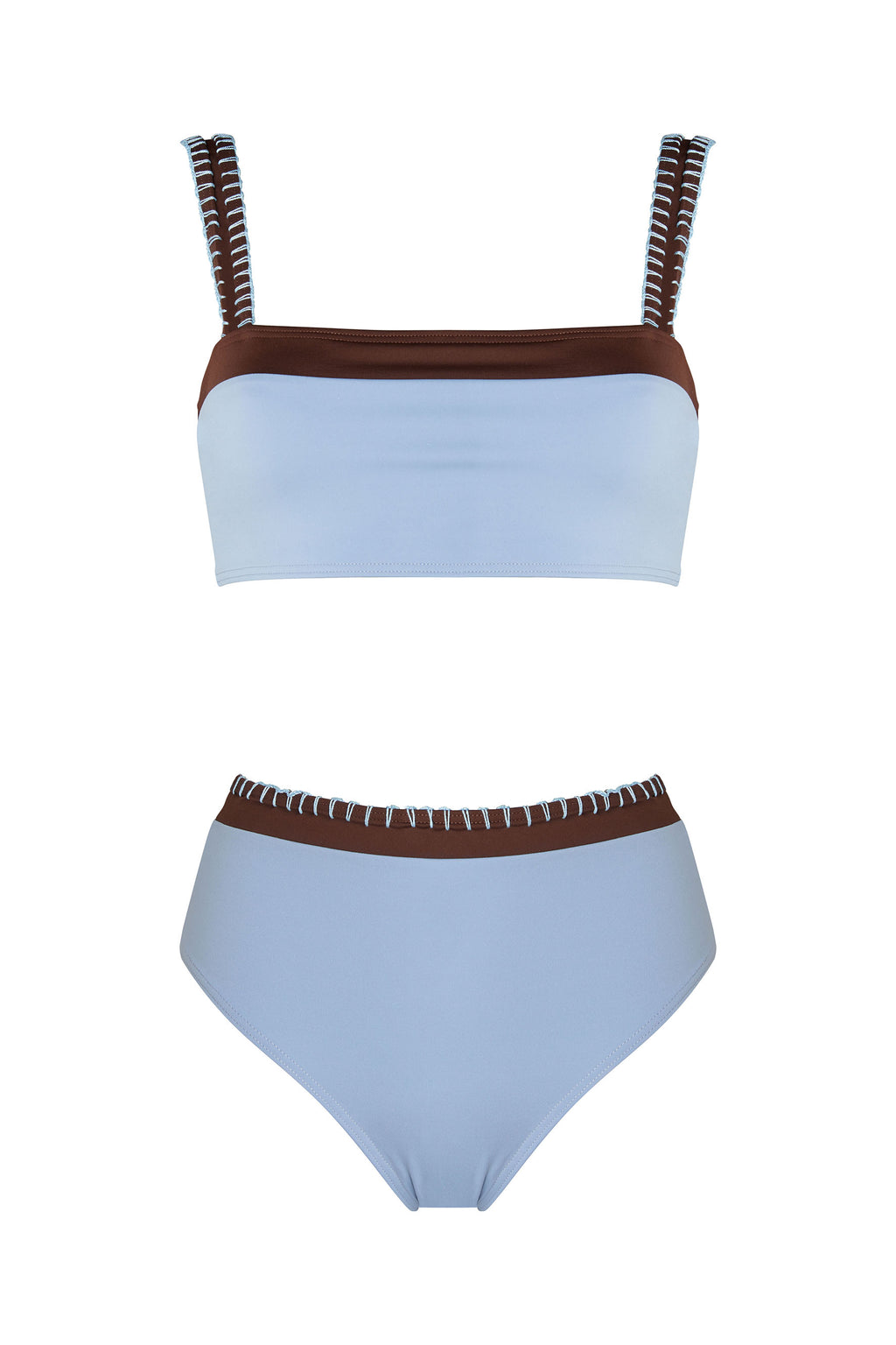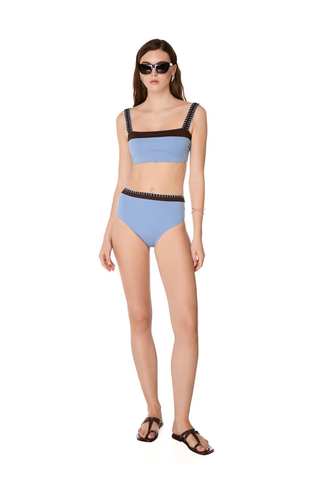 The Sky Blue CLEO bikini bottom features a regular-coverage, high waist design with a contrasting Brown panel embellished with the brand’s signature handmade stitching. Pair it with the GEMMA bikini top.