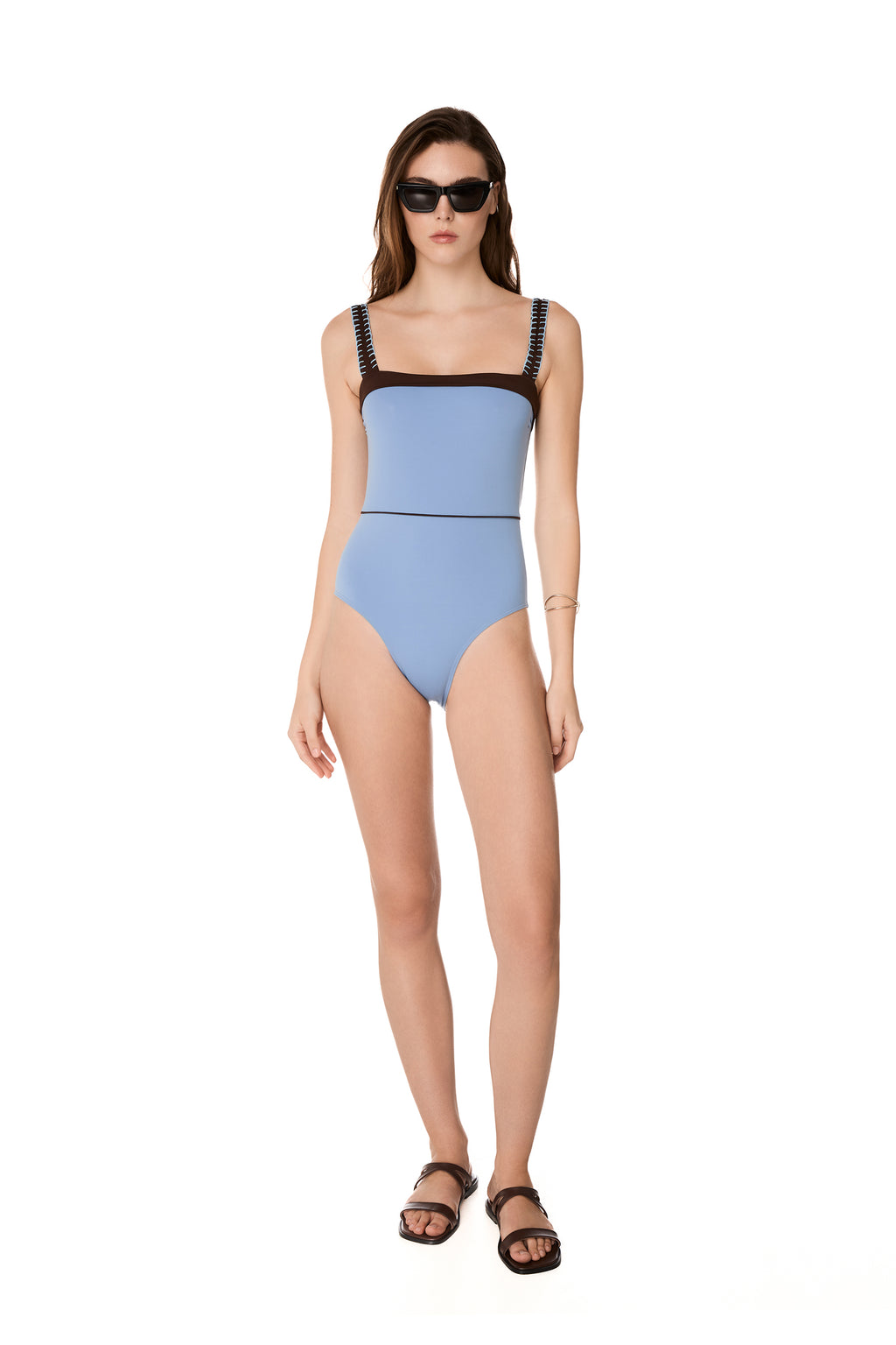 The CYANE one-piece swimsuit features a straight, square neckline of a contrasting panel embelished with the brand's signature handmade embroidery. The square open back is highlighted with contrast panels as well.