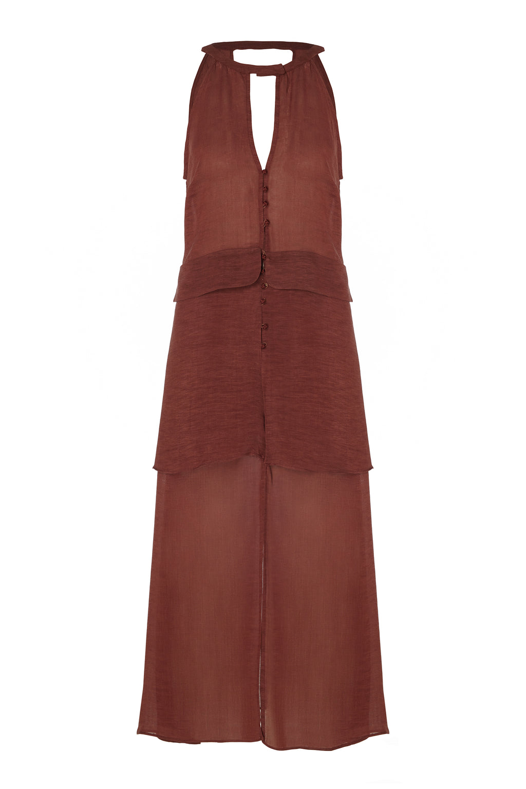 The EARTH dress is made of a linen and viscose blend. It has a lose cut fit wit a square open back, paneled skirt and center front opening with knot buttons.