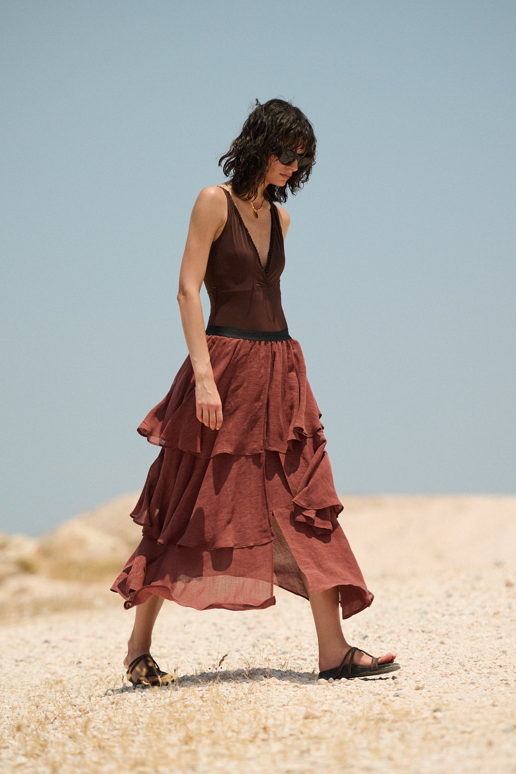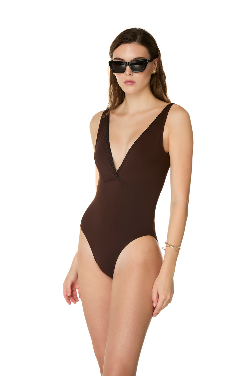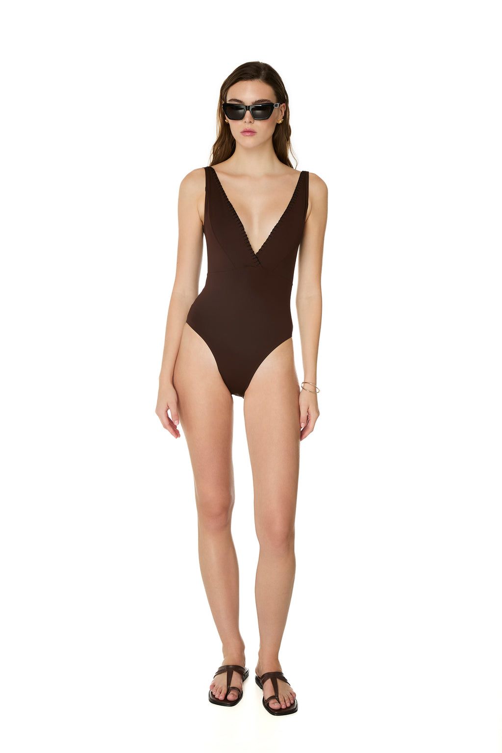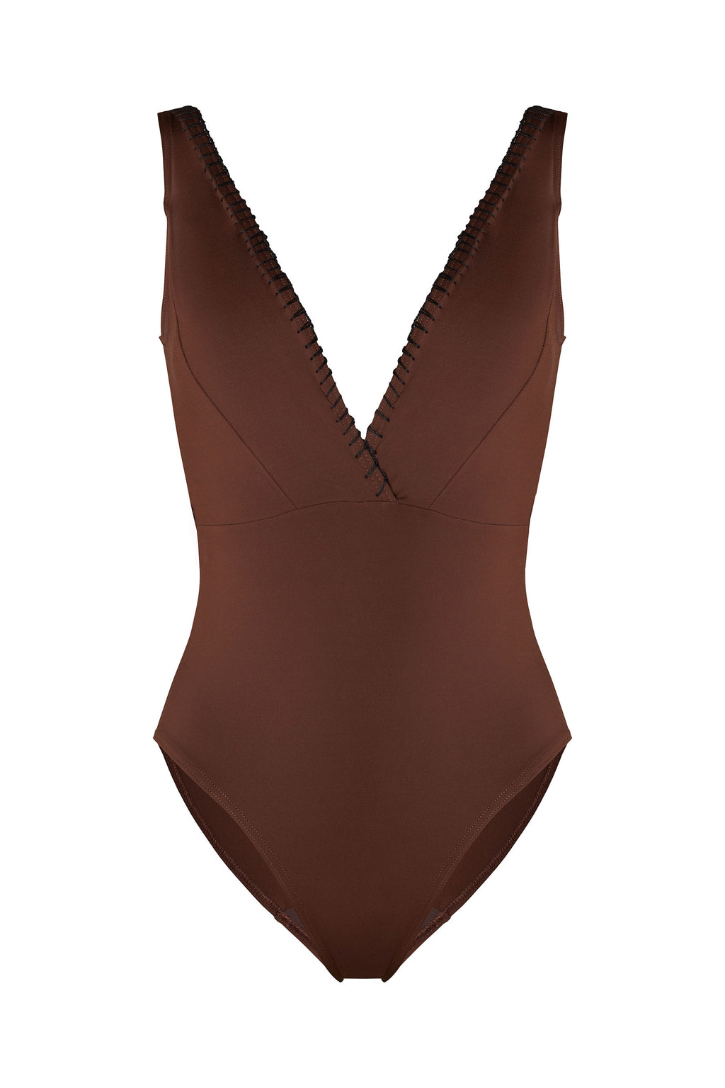 The ELIANNE one-piece swimsuit features a statement deep V-neck design embelished with the brand's signature handmade embroidery and an open back.