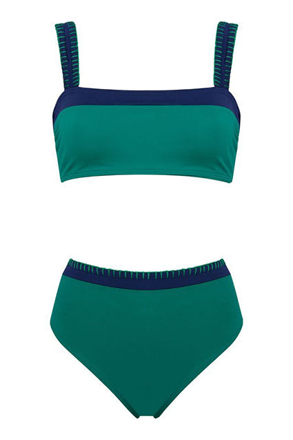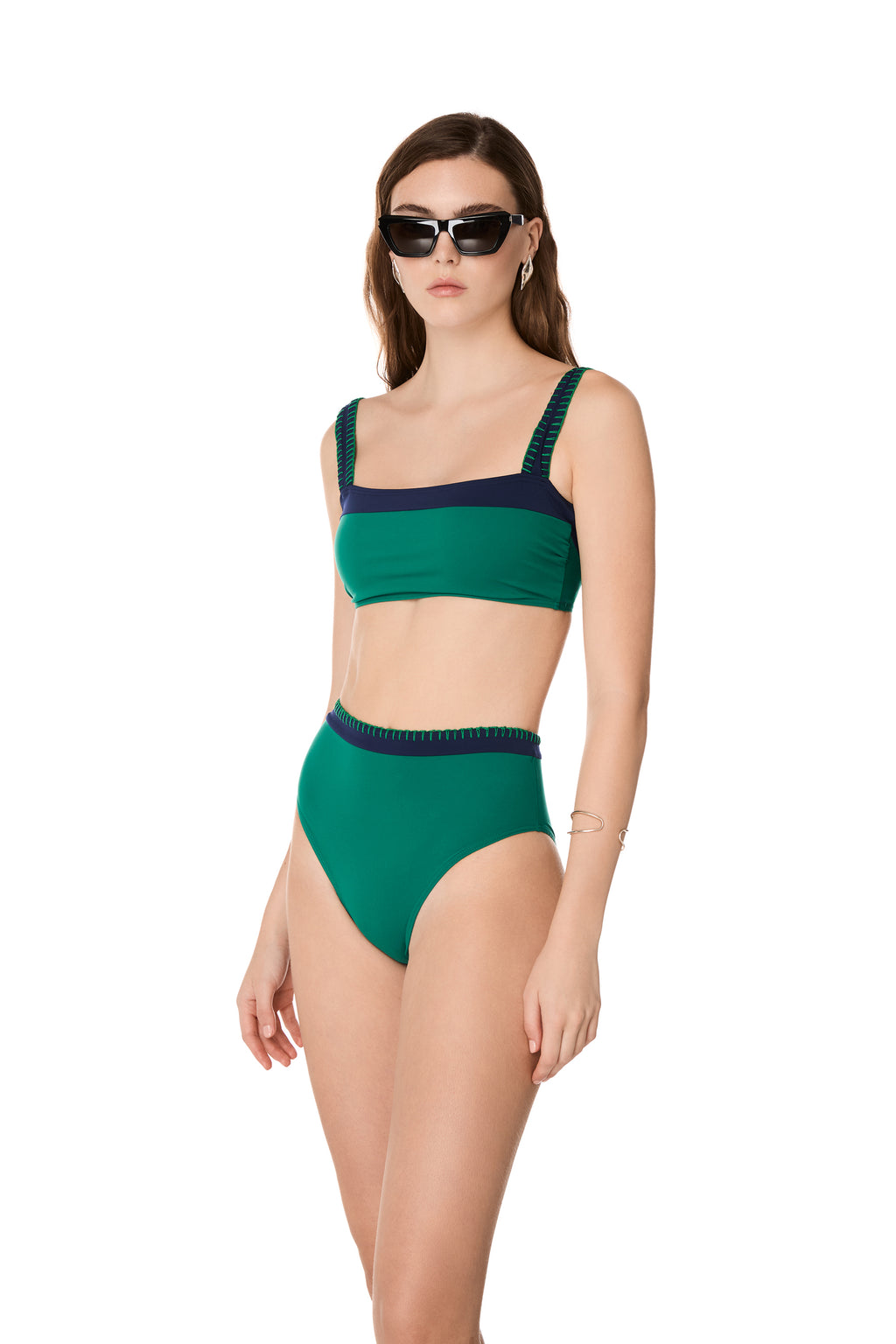 The Emerald Green GEMMA bikini top is made of a recycled fabric. It features a classic design with a straight, square neckline of a Navy Blue panel embellished with the brand's signature handmade stitching. Pair it with the CLEO bottom.