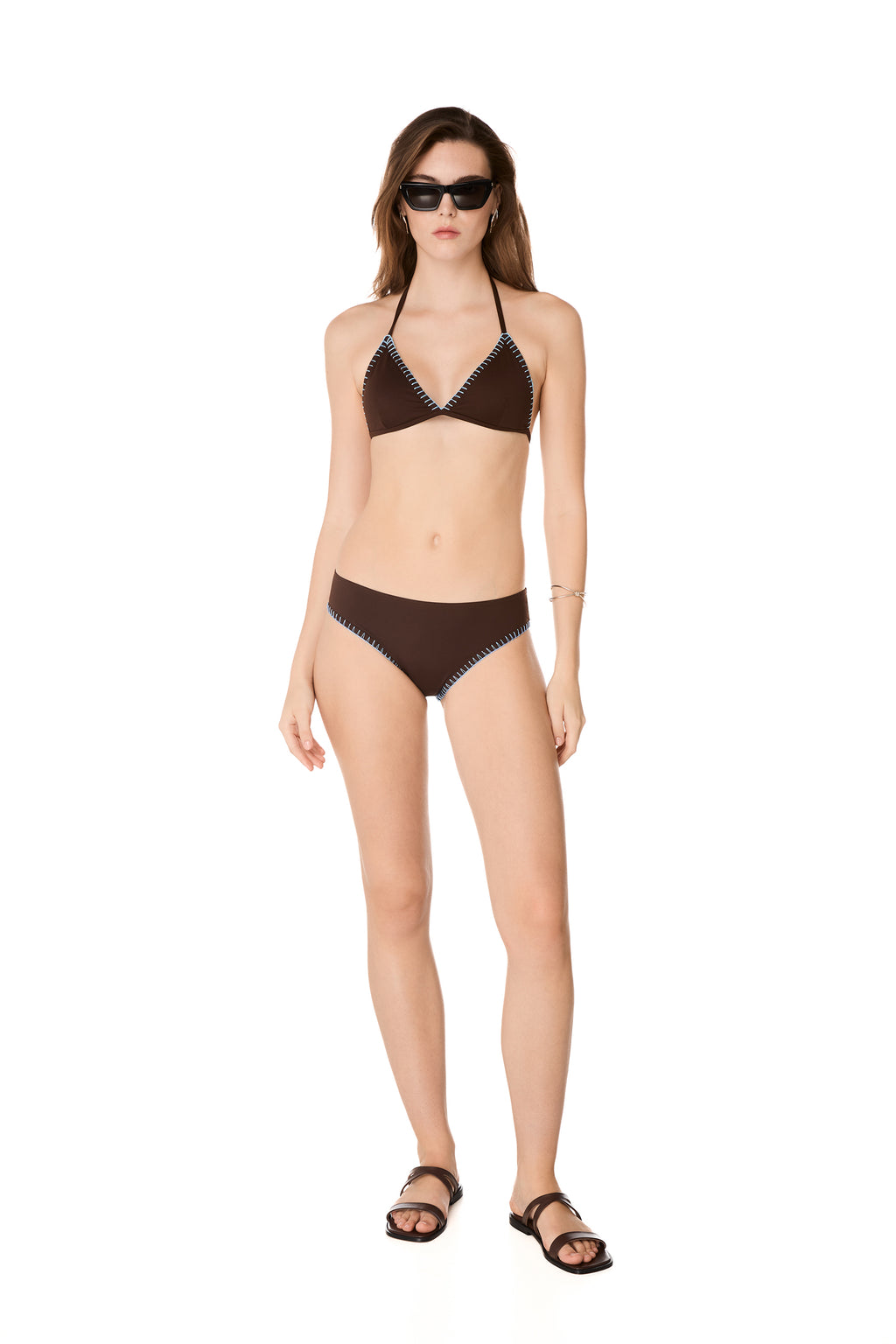The OCEAN bikini top is one of our best sellers. It features a classic triangle halterneck design, embellished with the brand’s contrasting signature handmade stitching and padding for support. Pair it with the ZOE bottom.