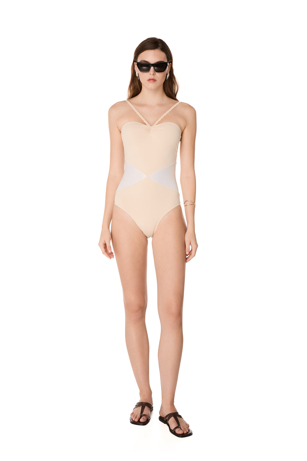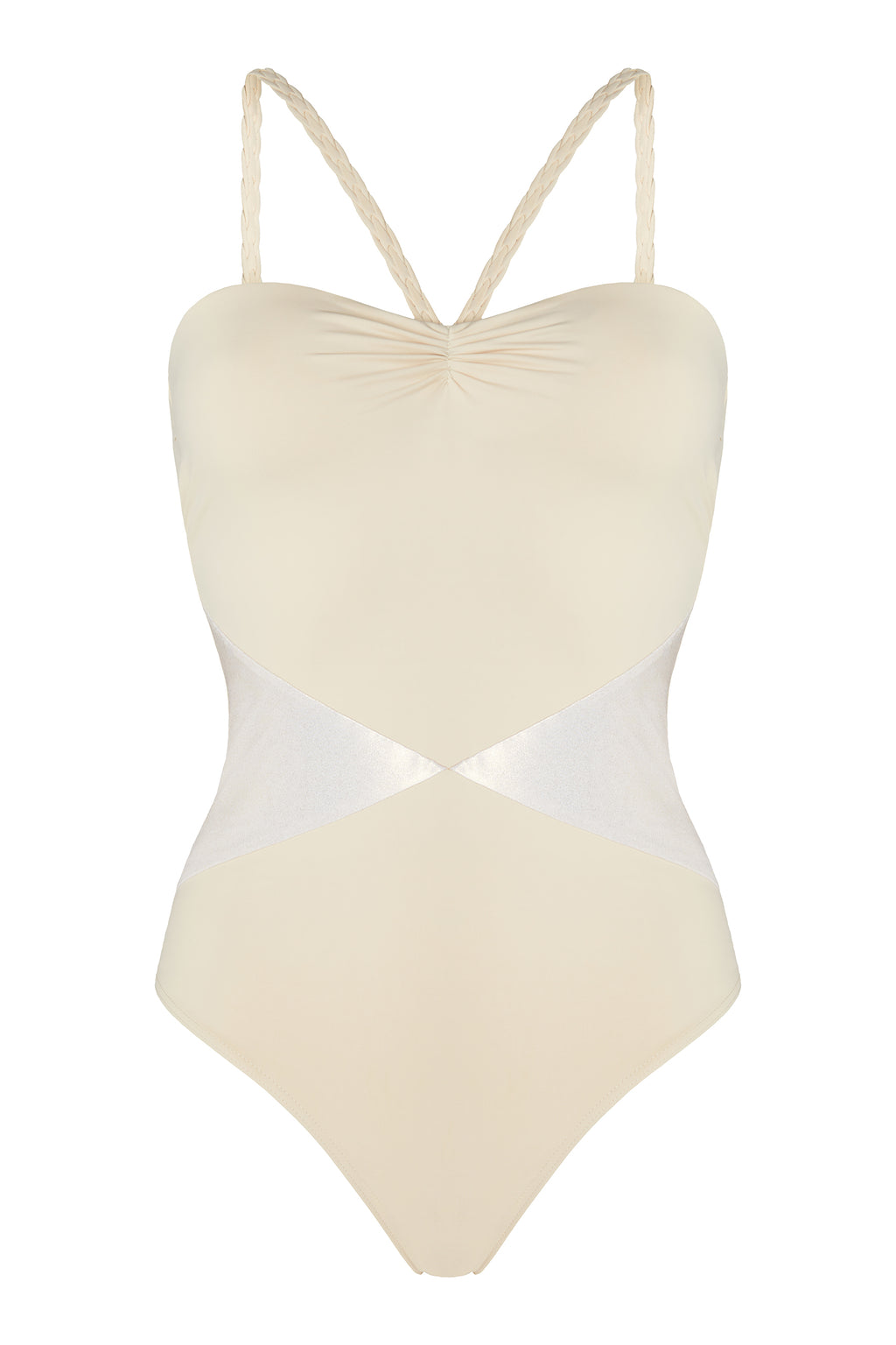 The RHEA one-piece swimsuit features a halterneck design with the brand’s signature laser-cut braids and two geometric color-blocking panels at the waist. It includes solid bust padding for extra support.