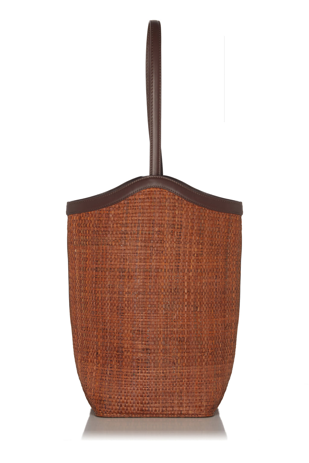 The SOLID raffia tote bag features a tall, tapered and structural design with a flat base. The top edge is finished with a dark brown leather trim that curves gently and includes a single leather handle.