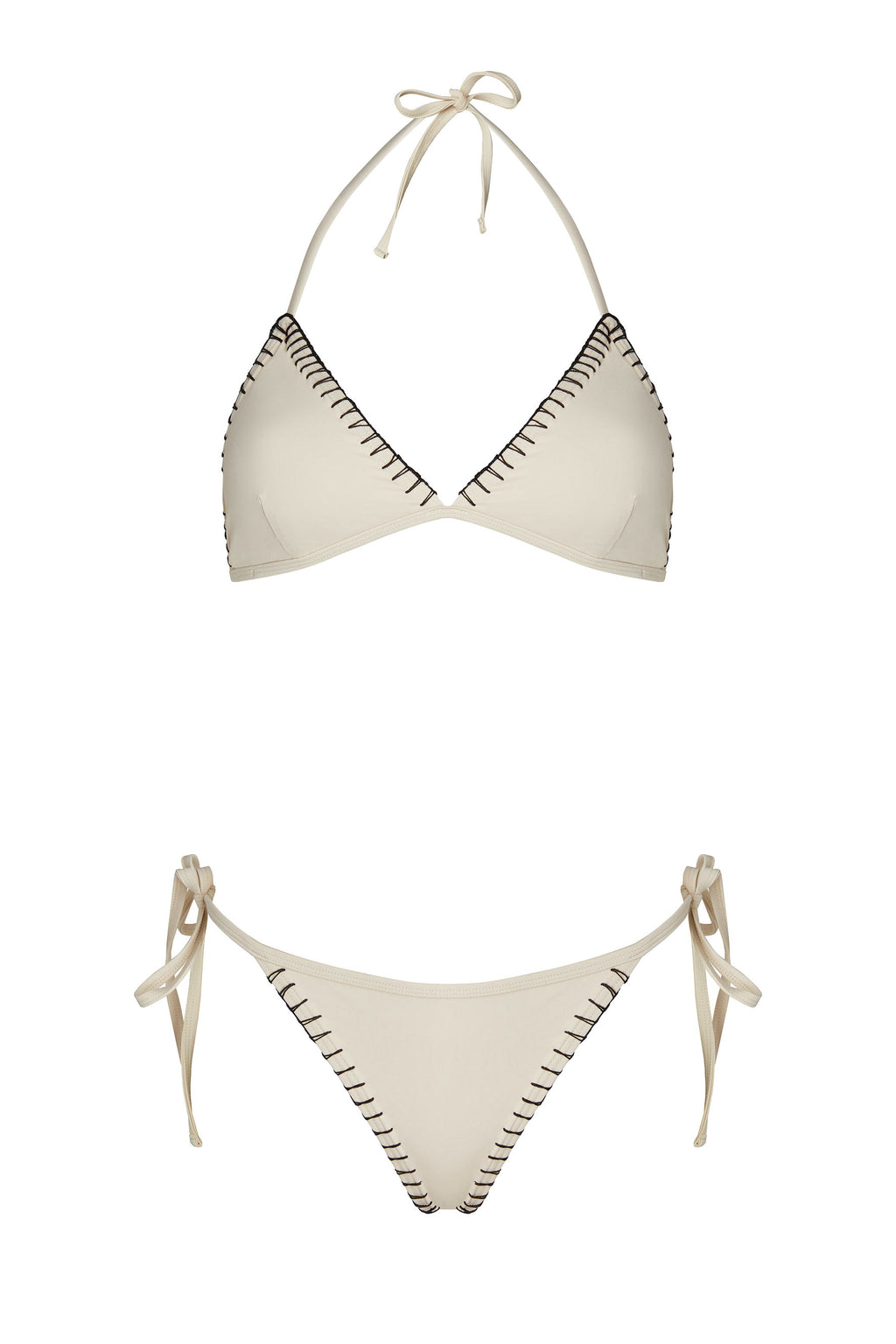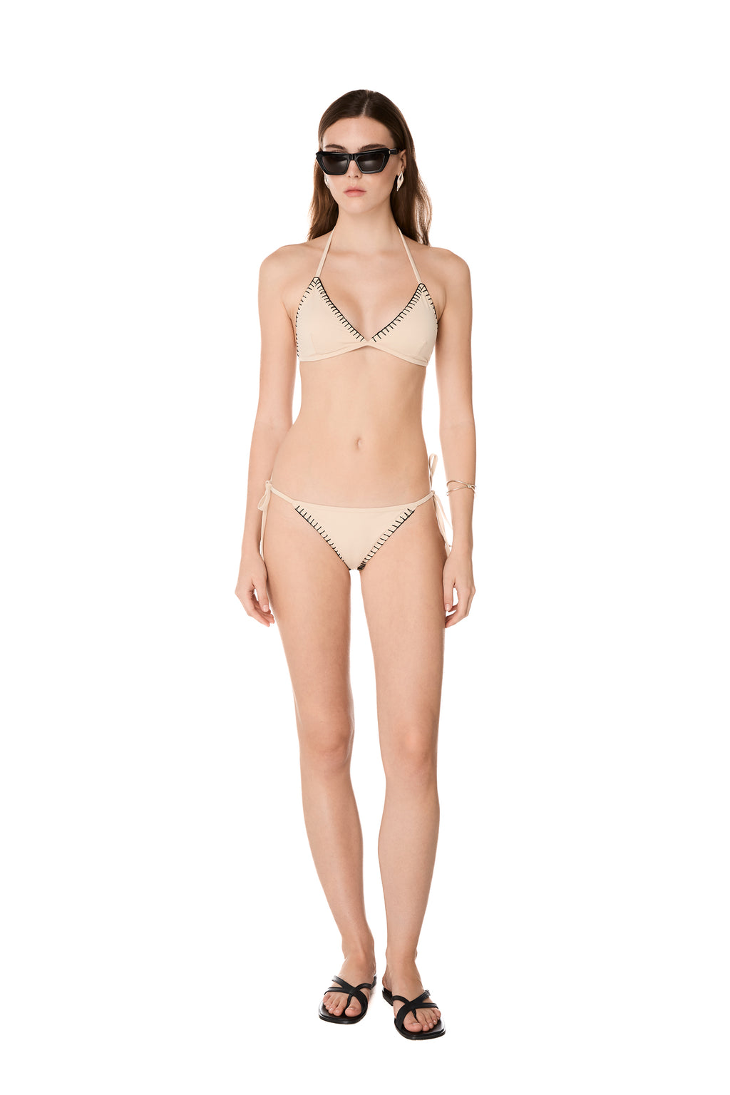 The ZOE bikini bottom in Stone is made of our classic spandex fabric. It features a regular-coverage, low-rise design with side ties and is embellished with a Black handmade embroidery. Pair it with the OCEAN bikini top.